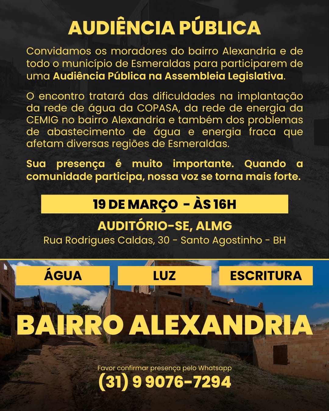 A audiência pública tem como objetivo reunir representantes da comunidade, autoridades públicas e concessionárias de serviços essenciais para discutir o cenário atual e buscar caminhos que garantam dignidade e melhores condições de vida para os moradores do bairro. O encontro será realizado no dia 19 de março, às 16h, no auditório da Assembleia Legislativa de Minas Gerais, localizado na Rua Rodrigues Caldas, 30, no bairro Santo Agostinho, em Belo Horizonte.