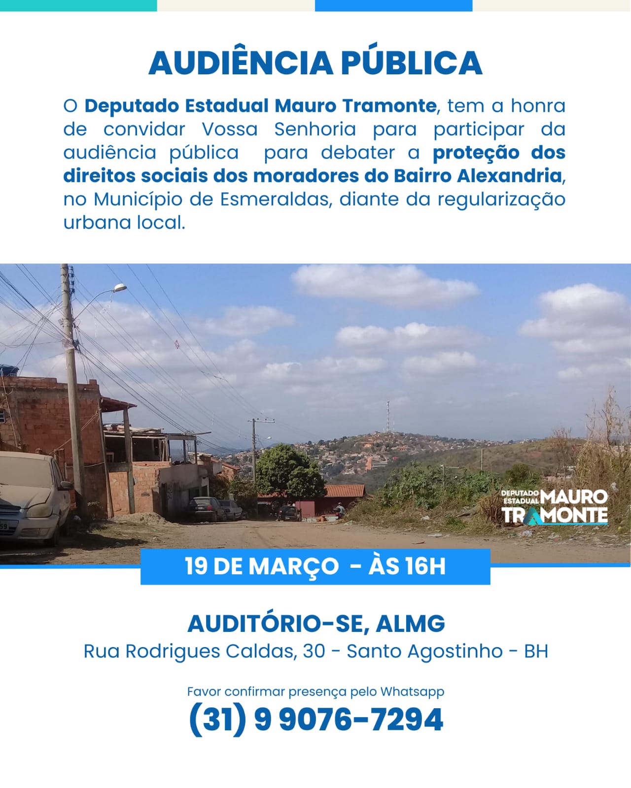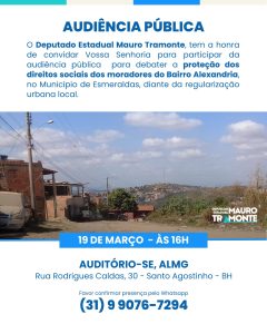 Os desafios enfrentados pelos moradores do Bairro Alexandria, no município de Esmeraldas, serão tema de uma audiência pública que será promovida pelo deputado estadual Mauro Tramonte na Assembleia Legislativa de Minas Gerais. A iniciativa busca discutir a proteção dos direitos sociais da comunidade diante do processo de regularização urbana que ocorre na região. Embora a regularização fundiária esteja em andamento há anos, muitos moradores ainda convivem com dificuldades que impactam diretamente sua qualidade de vida.