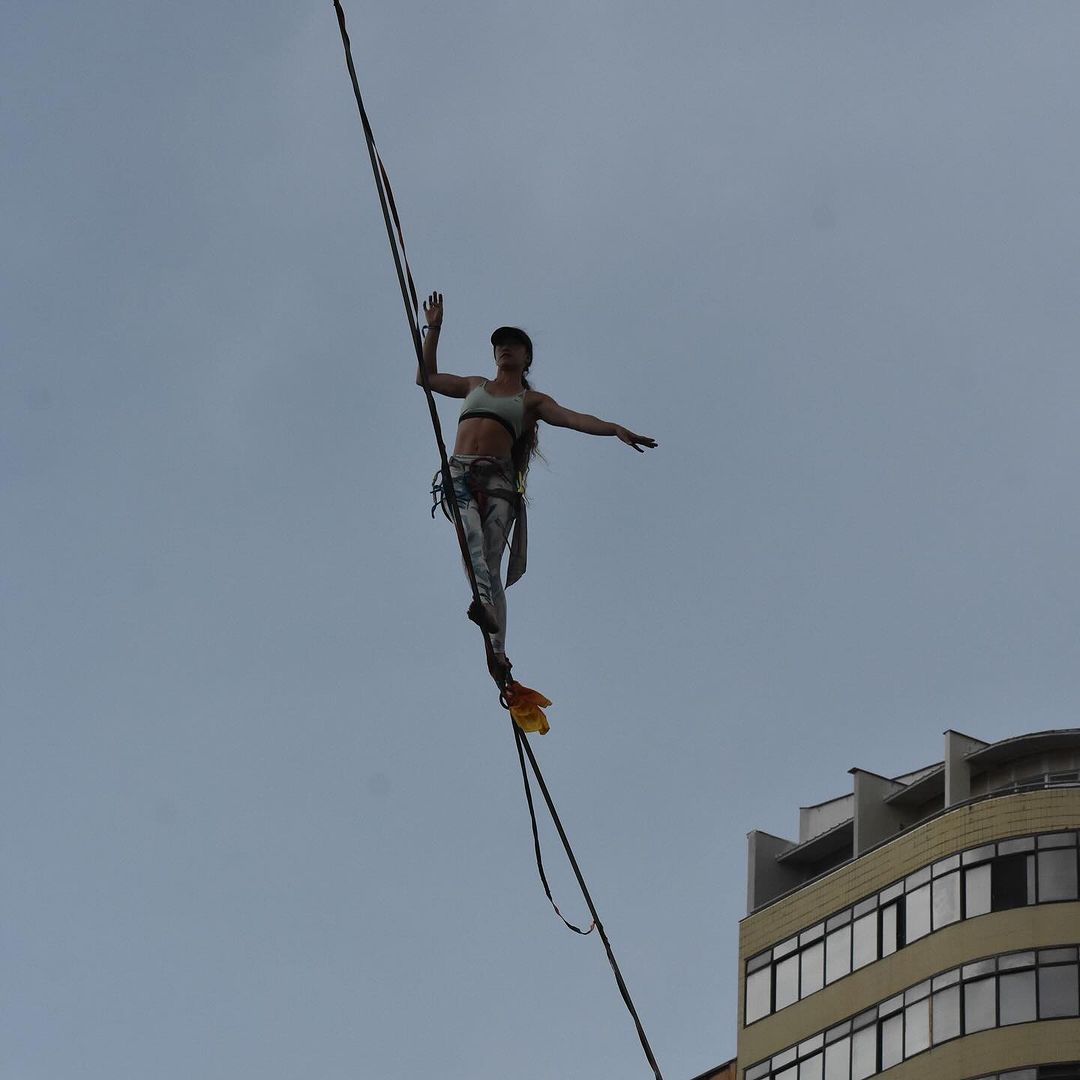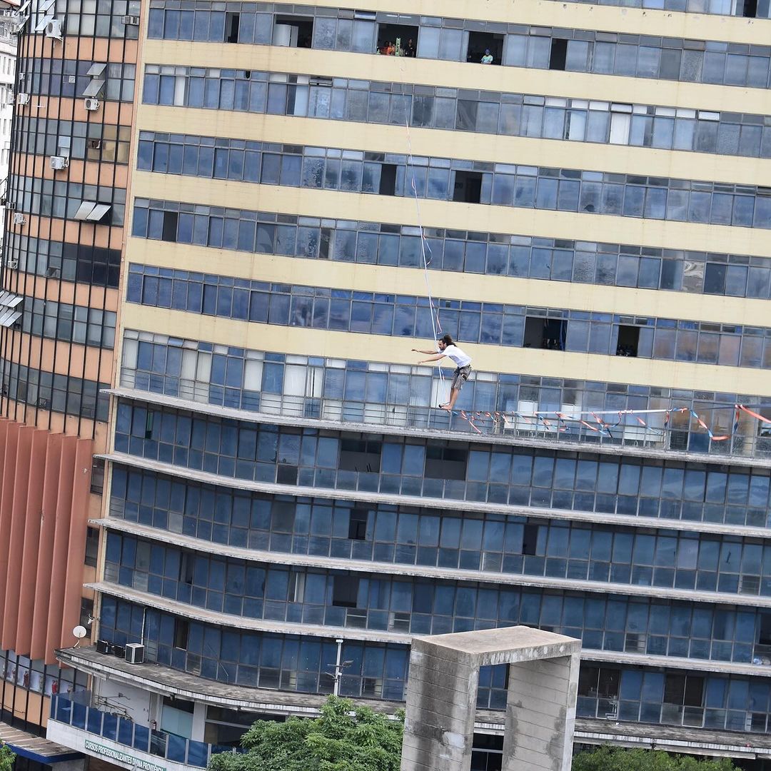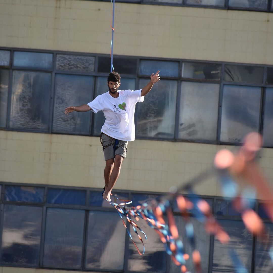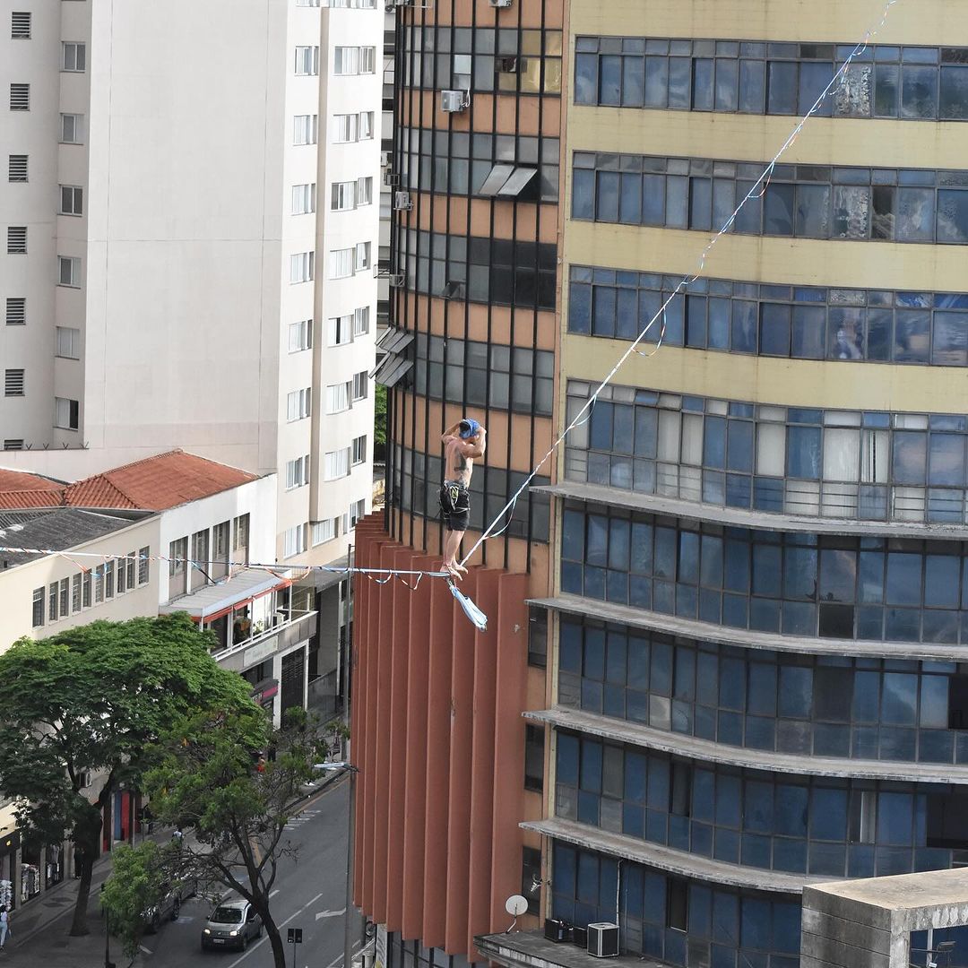 Para unir as cordas, Alisson explica que eles amarram os instrumentos no topo de cada edifício, unindo-os no meio e estendendo a fita até atingir a altura ideal para a travessia.