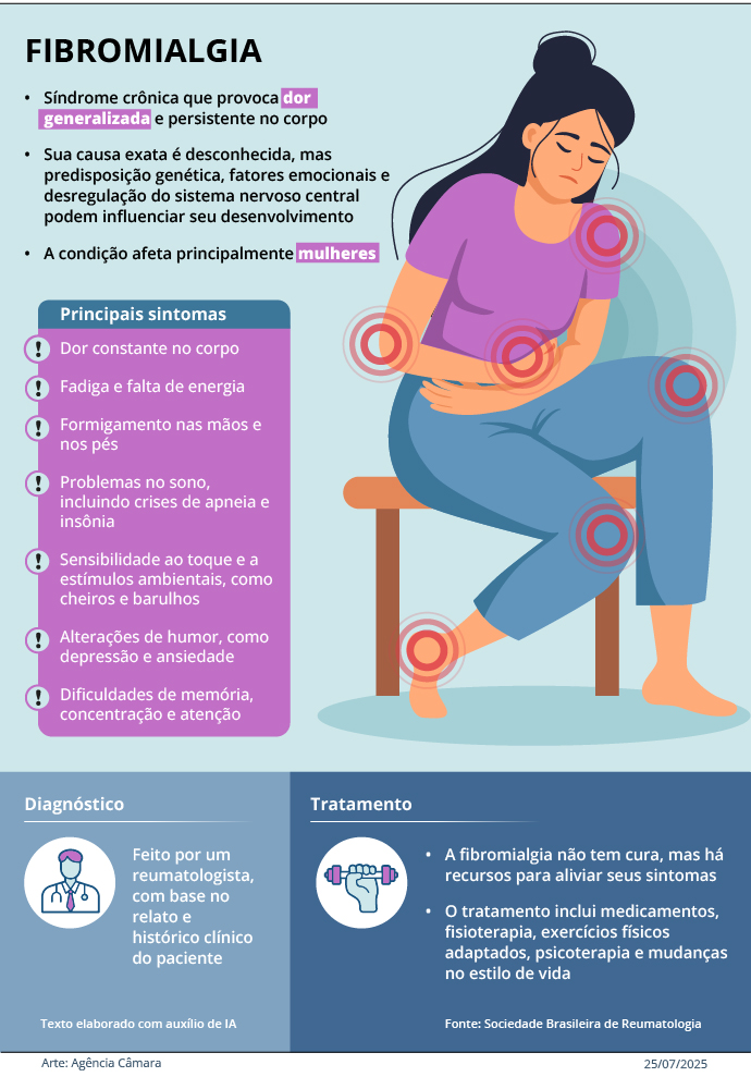 De origem desconhecida, a fibromialgia é uma síndrome caracterizada por dores crônicas e intensas por todo o corpo. Fadiga, insônia, ansiedade e depressão estão entre os seus principais sintomas. A lei surgiu de projeto (PL 3010/19) apresentado pelo ex-deputado Dr. Leonardo (MT), aprovado pela Câmara dos Deputados e pelo Senado Federal.