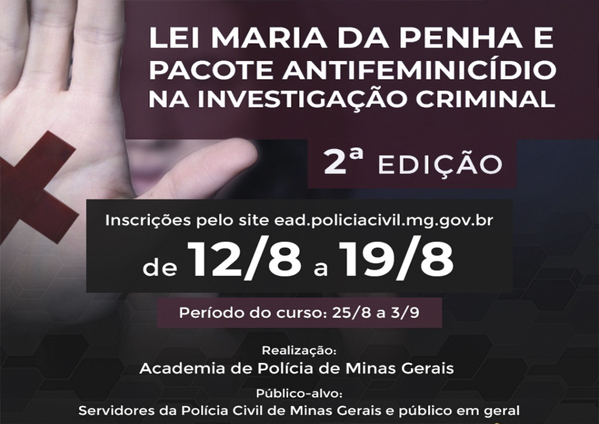 “Lei Maria da Penha e pacote antifeminicídio na investigação criminal” é o curso oferecido pela Polícia Civil de Minas Gerais (PCMG) para capacitar toda a população no enfrentamento da violência doméstica e familiar no estado.