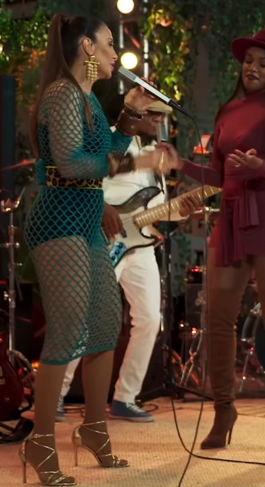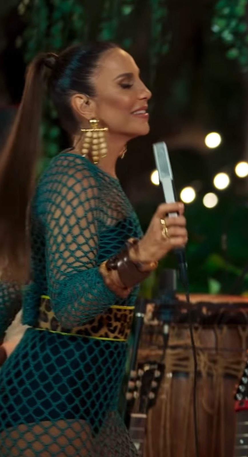 A dona Ivete Sangalo entregou tudo com um vestido no tom verde esmeraldas, todo no crochê e uma fita de representando uma coisa meio onça, bem no clima do ambiente onde foi gravação da música, primeiro que tudo que elas vestem é apoteótico e pega como fogo nos nossos olhos e nos deixa mais apaixonados nas nossas estrelas que a gente sempre vai bota fé.