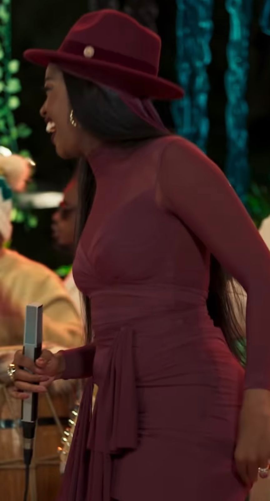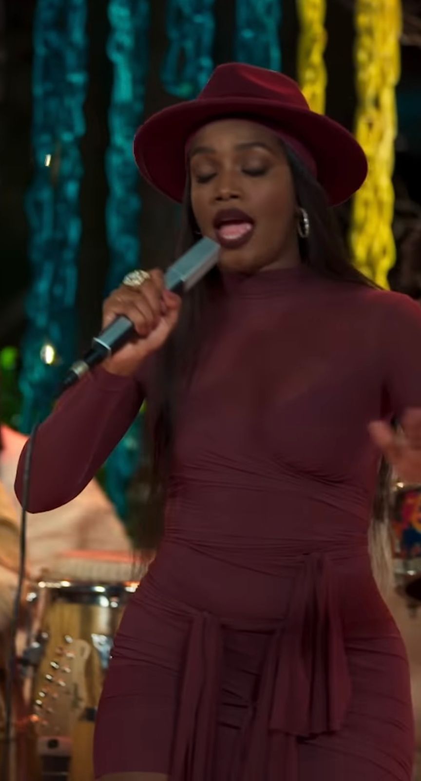 A composição dos looks das cantoras estão super criativos e com uma identidade própria Iza com um lindo vestido no tom Marsala da planta dos pés até o auto da cabeça com um chapéu belíssimo e um vestido super marcado no seu belo corpo. Aí gente a Iza sempre entrega conceito em tudo, absolutamente tudo.