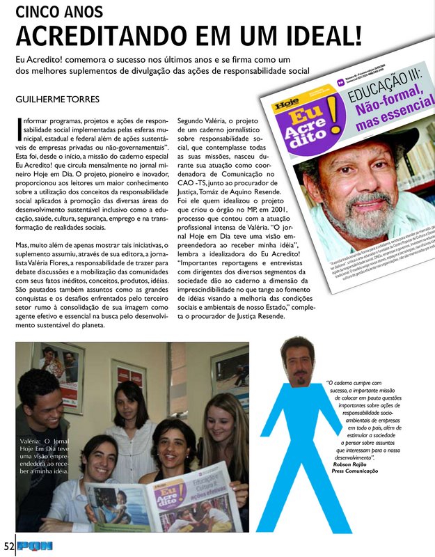 Desse trabalho e convivência no Terceiro Setor, nasceu o caderno EU ACREDITO! que editei e que circulou por 7 anos na imprensa mineira, com um enorme público, diversificado e bastante fiel à publicação que lhes dava rosto.