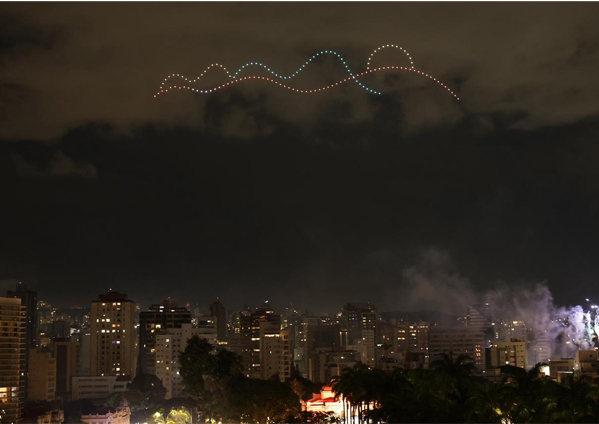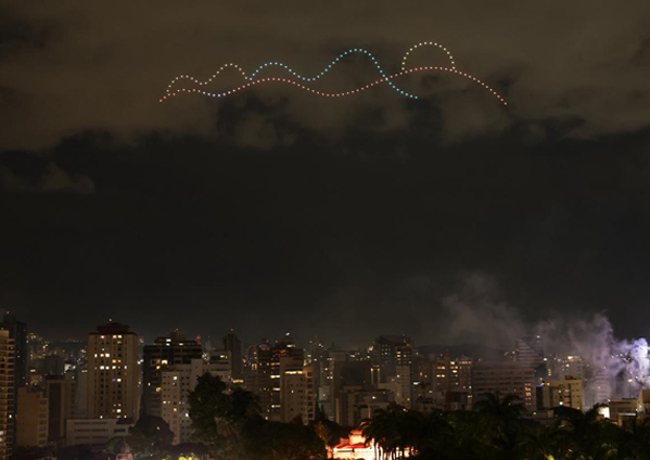 O momento da virada foi marcado por um espetáculo emocionante que combinou fogos de artifício de baixo ruído, com cerca de 5.500 disparos, e um show aéreo com aproximadamente 300 drones. As luzes desenharam no céu símbolos afetivos da cultura mineira, como o queijo, o pão de queijo quentinho, a música, as montanhas, o Mineirão, o café e outros ícones que arrancaram aplausos e emoção do público.